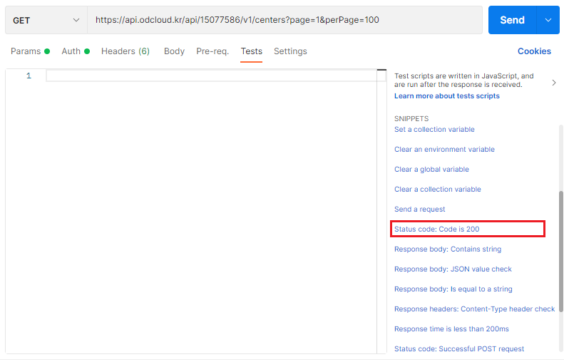 pm.test("TEST 1 : Status code is 200 : SNIPPETS", function ()