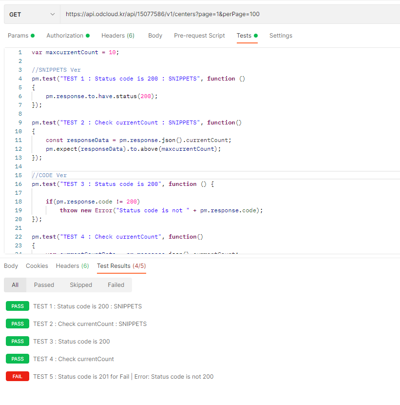 이후 Send 버튼을 통해 요청 정보에 대한 Response를 받으면 자동으로 작성한 테스트 코드가 실행되며 하단에 Test Results 탭에 결과가 표시됩니다.물론 개발 언어를 알고 있다면 지원되는 함수와 문법을 확인하면서 직접 작성도 가능합니다.