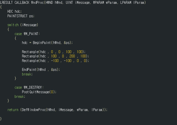 Rectangle함수를 통해 그리는 좌표는 논리 좌표(윈도우 좌표)이고, 화면상에 보이는 것은 물리 좌표(뷰 포트)의 영역이라는 것을 알 수 있습니다.